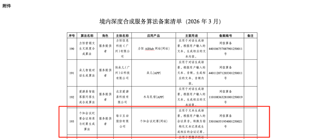 每日互动个知会议纪要生成算法通过国家深度合成服务算法备案