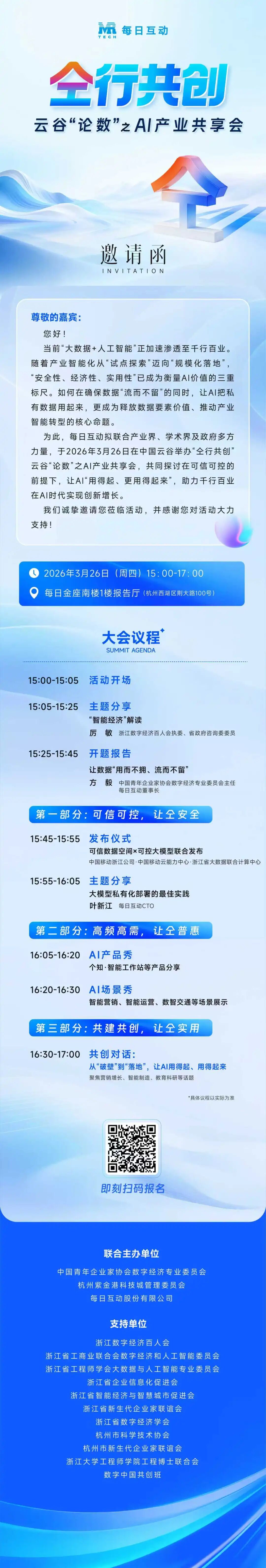 目前,每日互动个知·智能工作站集成的“个知写作助手文本生成算法”“个知会议纪要会议转录与纪要生成算法”等均已通过国家备案,共同支撑起高频办公场景,为团队及个人用户持续提效。值得期待的是,3月26日,每日互动即将在“仝行共创 2026 云谷论数之 AI 产业共享会”上,发布全新升级的“个知”智能工作站,为广大用户带来更多创新功能与体验优化。