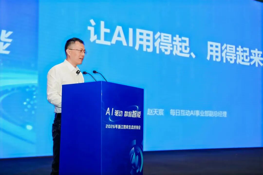 为全面落实浙江省《关于支持人工智能创新发展若干措施》,统筹布局算力、数据、模型三大基础设施,全力打造人工智能创新发展高地的发展目标,3月31日下午, “AI驱动 ·数据智能”2026年浙江数商生态对接会在宁波成功举行。政府领导、浙江数商企业代表、投资机构、金融机构、服务机构以及媒体代表等齐聚一堂,共话数据智能发展新机遇。 领军型浙江数商 每日互动AI事业部副 总经理赵 天宸应邀出席 会议, 并围绕“让AI用得起、用得起来”进行了主题演讲。