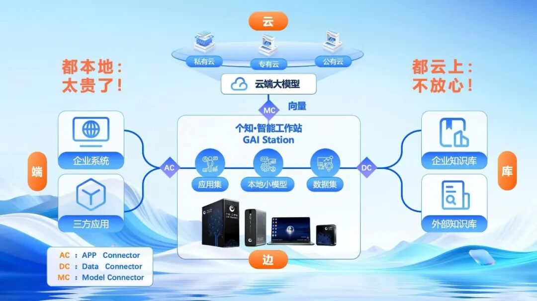 个知工作站创新采用“云边端库”混合云架构:"边"侧部署本地工作站,实现本地数据处理与计算;"云"侧依托大模型算力,可灵活按需对接私有云或数据“流而不留”的可信公有云:"端"侧覆盖手机、电脑等终端设备,确保确保服务的便捷性和全覆盖;"库"侧则构建企业私有知识库,对接行业高质量数据,实现数据资产的沉淀与值。