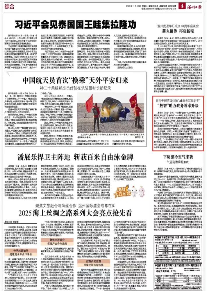 十分钟“读透”十万字材料、基于专属知识库秒变“思考伙伴”——11月14日,来自温州市直单位、县(市、区)部门的160多位政务工作者现场尝试由每日互动打造的人工智能大模型产品——“个知·智能工作站”,现场体验如何用AI高效辅助政务文案与规划编制工作。这是《温州日报》记者从首场“人工智能赋能规划编制和公文写作”数享会上了解到的。
